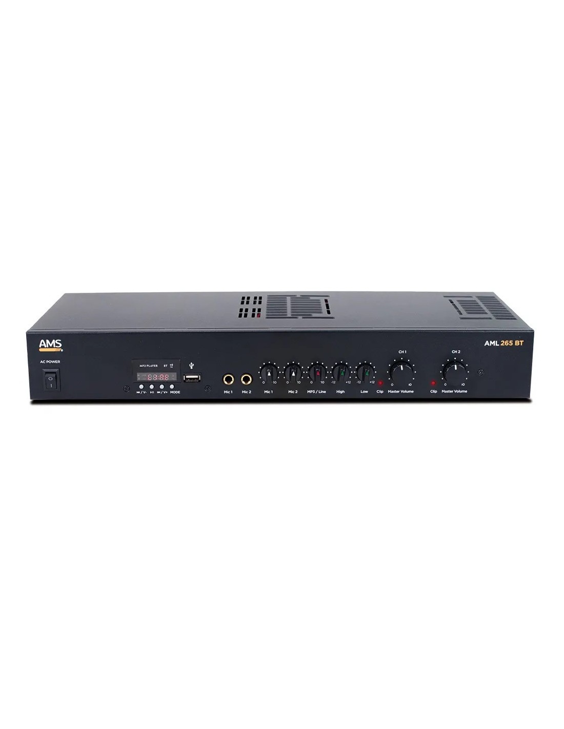 AMU 265 BT es un mezclador/amplificador de 2 canales que puede operar tanto en baja impedancia (4-16 Ohm) como L100V. Incluye 3 canales de entrada (1AUX + 2 MIC),corpora una interfaz USB/SD/FM para archivos de audio externos, así como conectividad Bluetooth, siendo posible enviar archivos de audio desde un smartphone o dispositivo similar. La pantalla muestra toda la información de pista, modo de funcionamiento, nivel de volumen, número de pista o tiempo transcurrido. Incluye 2 controles de tono y alimentación de emergencia 12V DC