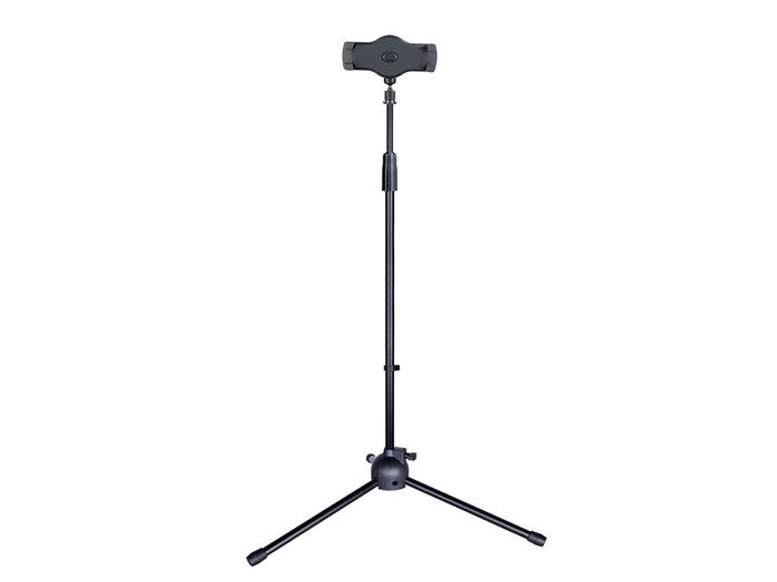 Soporte universal para tablet. Tubo fabricado en acero y base en plástico. Soporte para tablets con fijaciones ajustables para varios tipos de tablet. Altura ajustable hasta 1.6 m