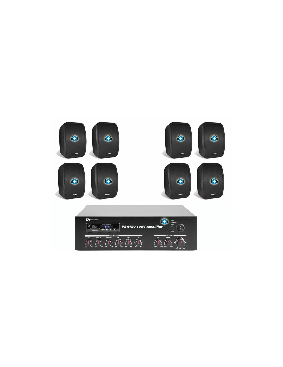 Equipo de sonido para instalaciones en interior con 8 altavoces de 4 pulgadas en color negro y amplificador con ursb y bluetooth