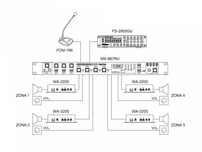 Mezclador/preamplificador con matriz de audio de 5 canales asignables a 4 zonas de salida con control independiente de volumen. Reproductor USB/SD con sintonizador digital de radio FM. Distribución de audio en instalaciones con varias zonas y diferentes programas musicales. Control remoto del volumen en cada zona.