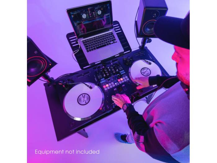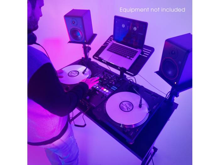 Tu portátil es el protagonista absoluto de todo tu equipo y queda situado en el centro de la mesa, bien sujeto con los pasadores integrados: aunque lo inclines al máximo, no se caerá. Tanto las bandejas de los altavoces como la del portátil se pueden mover con precisión a lo largo de todo el riel trasero de la mesa Gravity® FDJT 01 DJ-Desk con solo deslizarlas a izquierda y derecha.