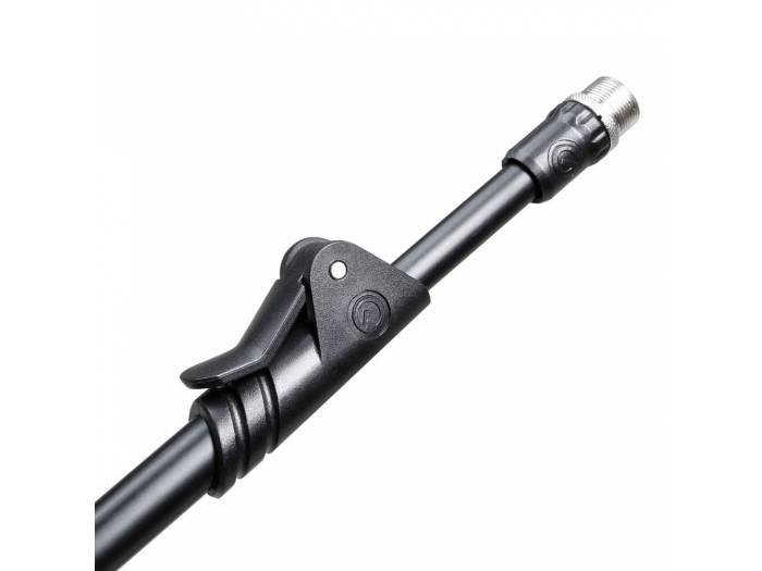 La posición y la inclinación del brazo jirafa telescópico se pueden ajustar de manera muy precisa mediante 2 tornillos de fijación. Su sistema de bloqueo rápido y longitud máxima de 88 cm ofrecen una gran flexibilidad en cuanto al posicionamiento del micrófono. El manguito de ajuste de altura, duradero y fácil de regular, y las roscas de apriete del MS 2222 B son de plástico ABS de alta resistencia con un recubrimiento de material termoplástico antideslizante y suave al tacto para hacer más cómodo su manejo. Además, la contratuerca especialmente diseñada permite un montaje rápido y seguro del pie de micrófono sin necesidad de herramientas.