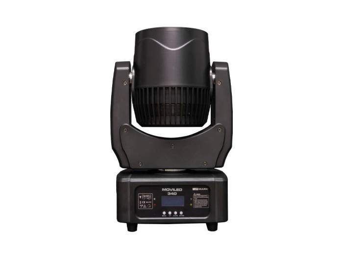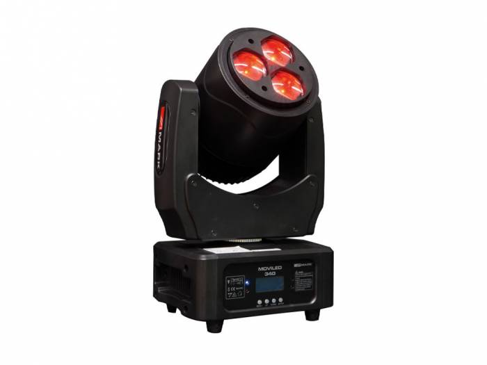 MOVILED 340 es una cabeza móvil con 3 LEDs RGBW de 40 W cada uno. Incorpora zoom motorizado entre 8º y 55º. puede controlar a través del protocolo DMX y trabajar con programas independientes tanto por audio como maestro/esclavo. Si el dispositivo está funcionando bajo el protocolo DMX, es posible utilizar 18 o 26 canales, aumentando las características y efectos como dimmer lineal, estrobo, shutter y control de color de cada LED o del dispositivo completo. En el panel frontal hay una pantalla para navegar y programar el menú utilizando los botones colocados a tal efecto. Entre las funciones configurables desde el menú, cabe destacar la inversión de los ejes Pan y Tilt, la sensibilidad de audio o la selección de modos de uso.
