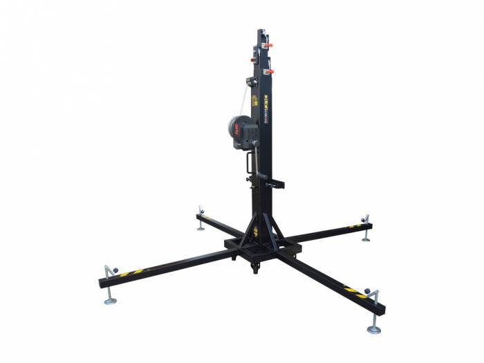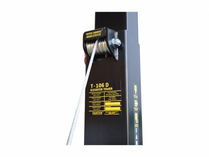 La torre elevadora telescópica modelo T 106 es una torre diseñada para levantar cargas verticales hasta 225 Kg y 6,4 metros de altura. Compuesta por 5 perfiles de acero extensibles elevados mediante un cable de acero de alta resistencia. Fijación del tramo de la torre a la altura de trabajo con pasador de seguridad automático de acero. Patas con apoyos antideslizantes de goma. Todo el sistema se opera mediante un cabrestante de accionamiento manual.