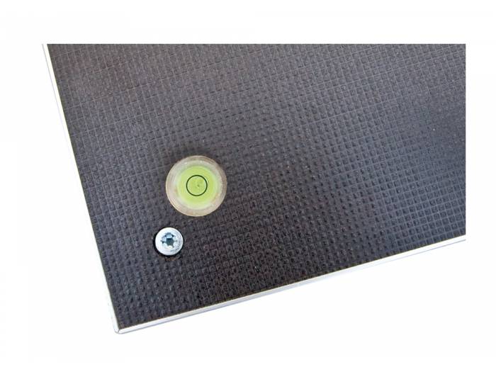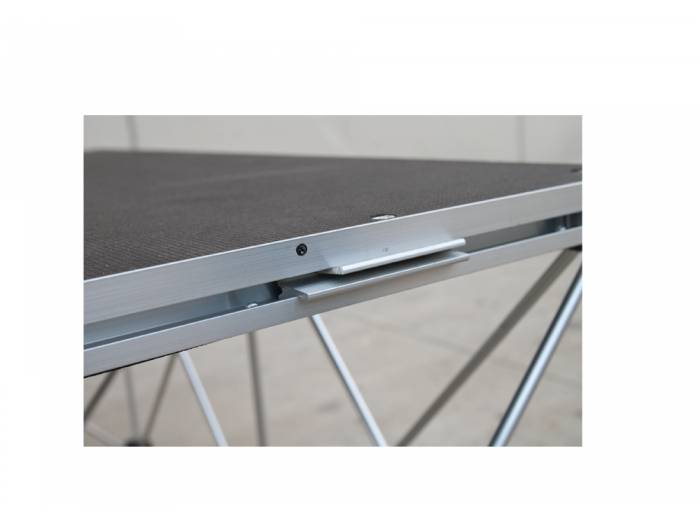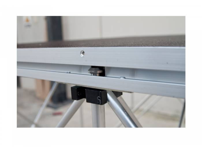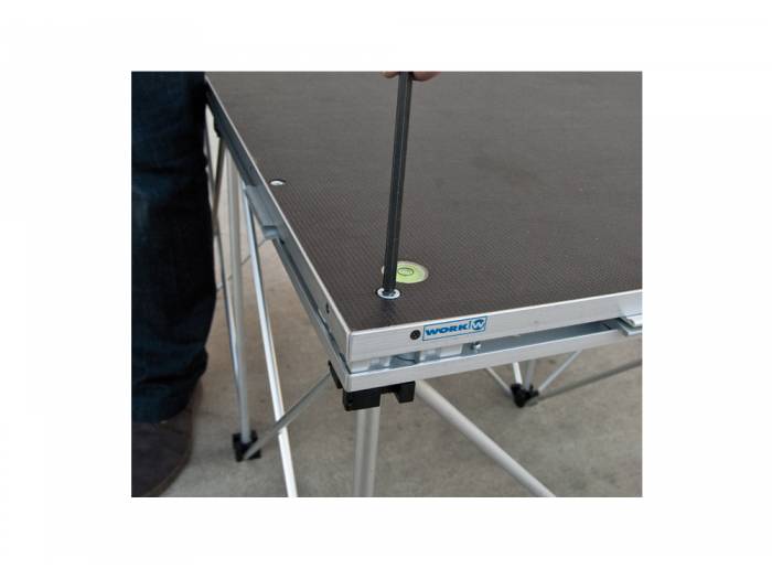 SA 1000 es una sistema de tarima compuesto de una base de madera con suelo antideslizante de 35 mm de espesor y 1000 x 1000 mm de superficie, con perfiles de aluminio. Dispone de patas plegables de aluminio que permiten elevar la tarima a 1000 mm, e incorporan un nivel de burbuja para facilitar su nivelación al efectuar la instalación.